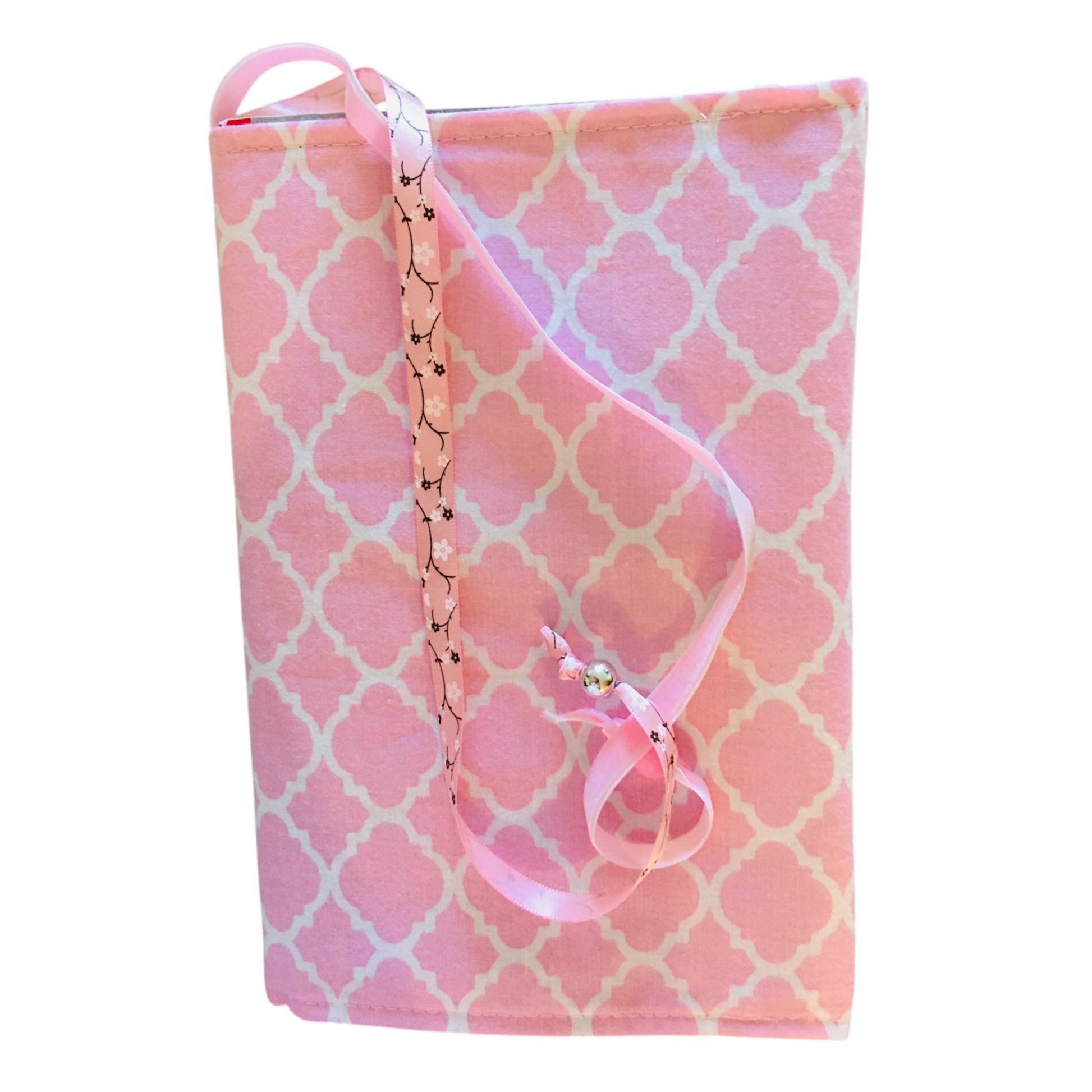 Pink interior with white mosaic grid patterns, 2 ribbons separating pages: pink velvet and satin, 1 apple blossom print, insertion of 2 elastic bands, weight: 47g