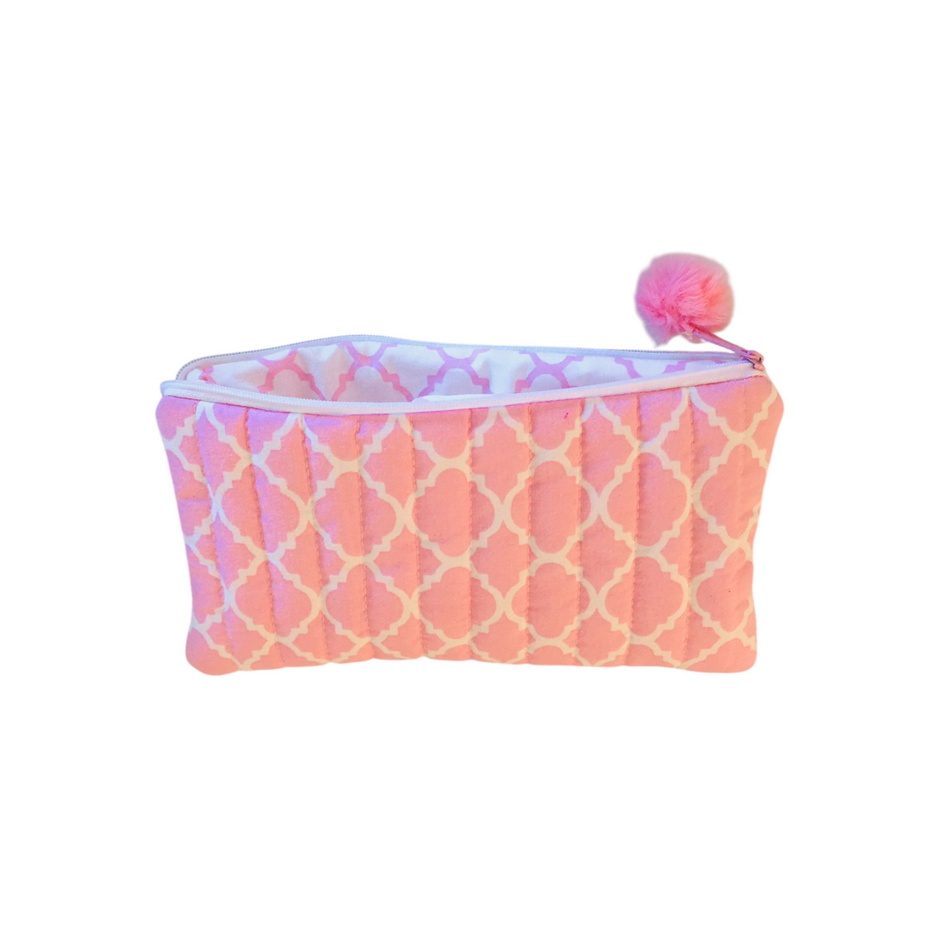 1: 9x5' quilted tote case, pink exterior with white mosaic pattern, white and pink mosaic interior, 3mm white zipper,