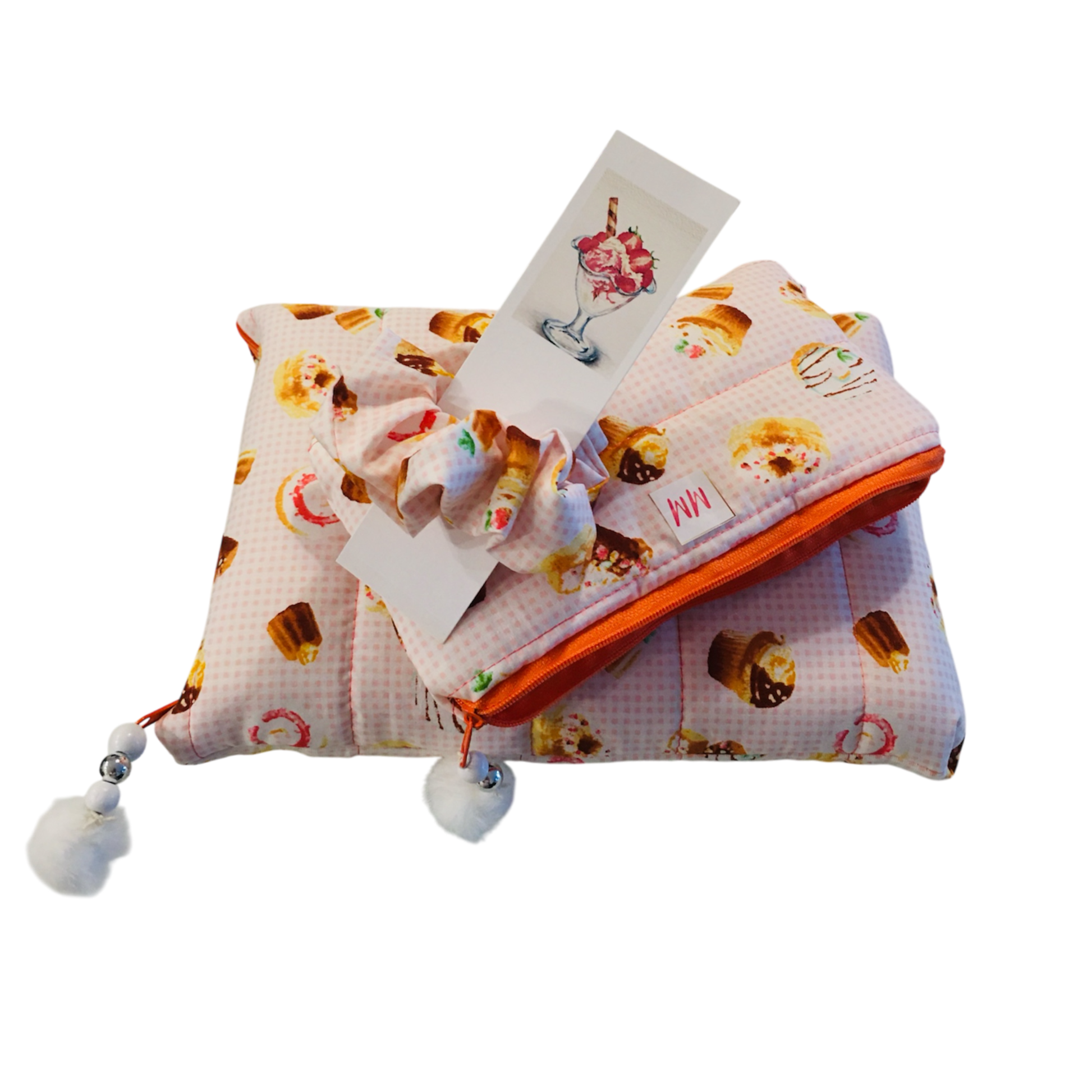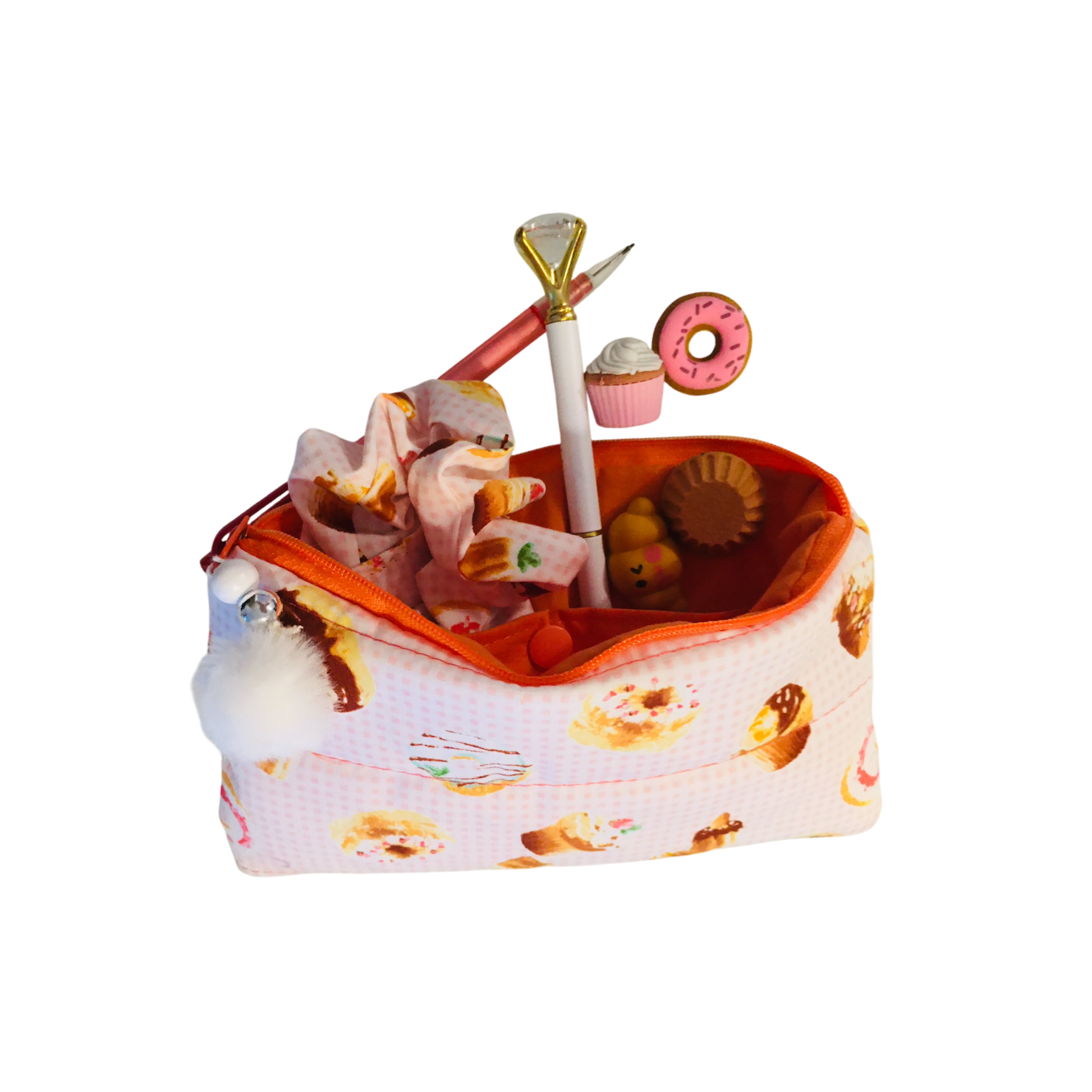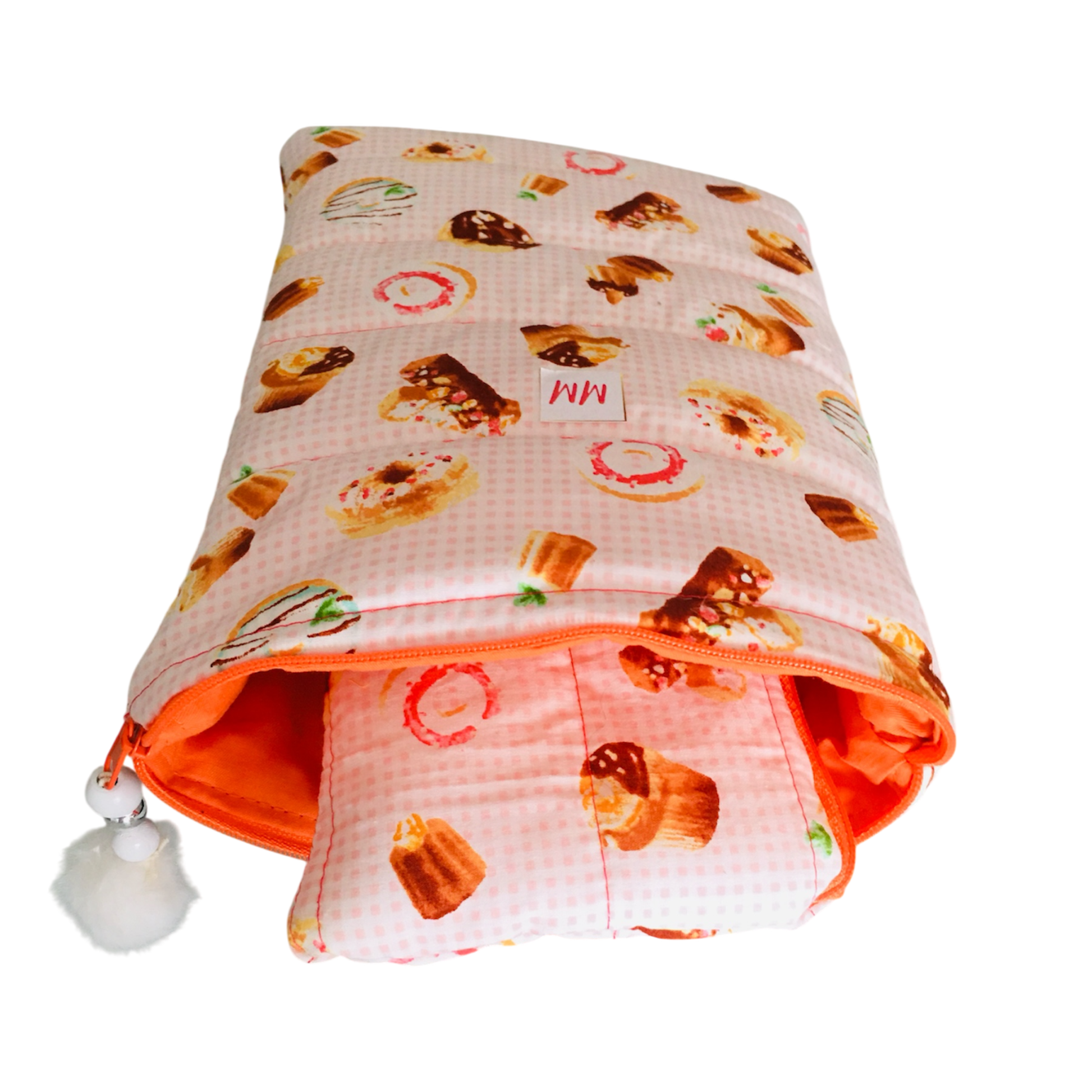 Cet ensemble délicatement assorti de beignet et cup cake sur un fond blanc à mini carreaux au couleur pêche brillante. L'intérieur et la fermeture éclair est de couleur orangé. Breloque blanche et argenté pompons blanc.