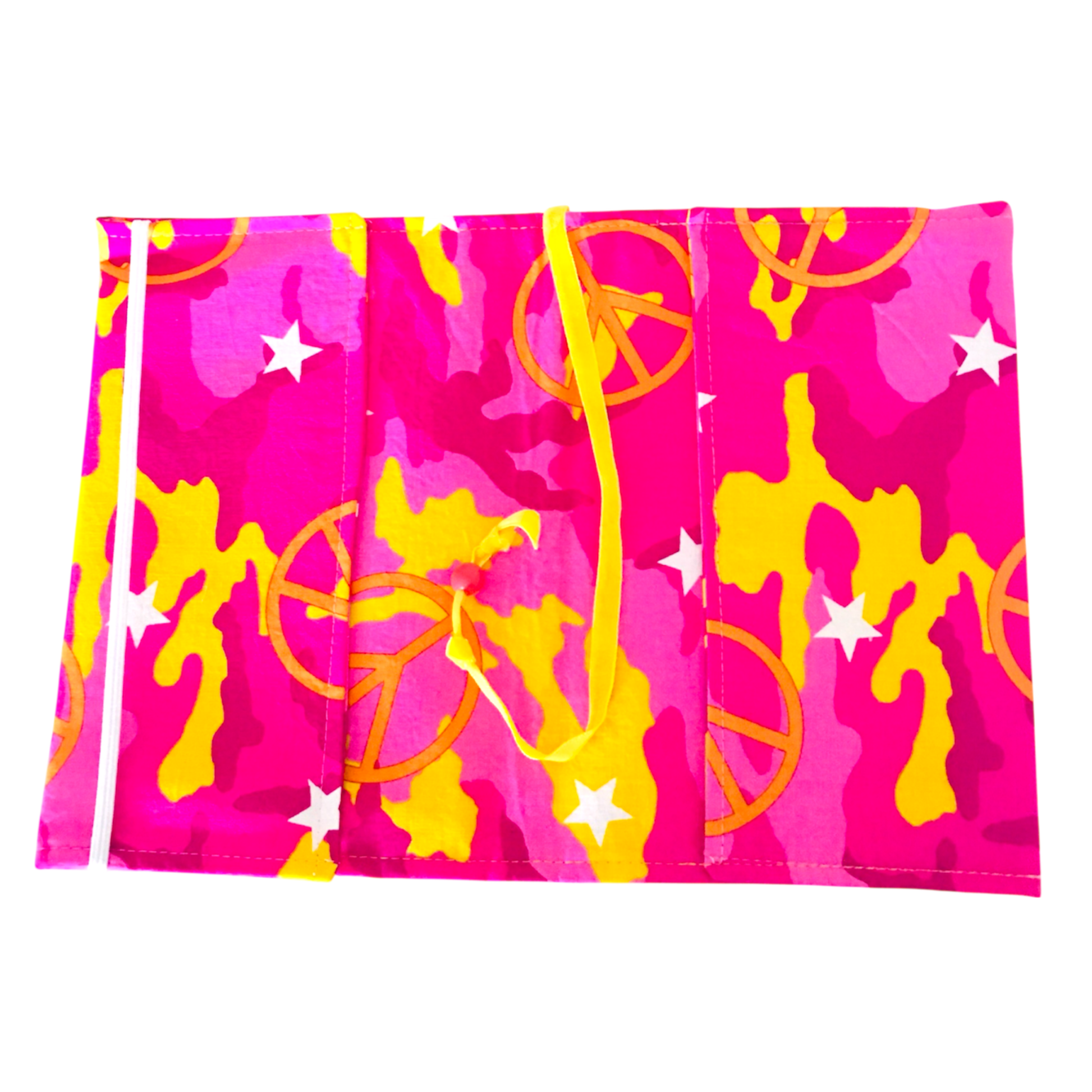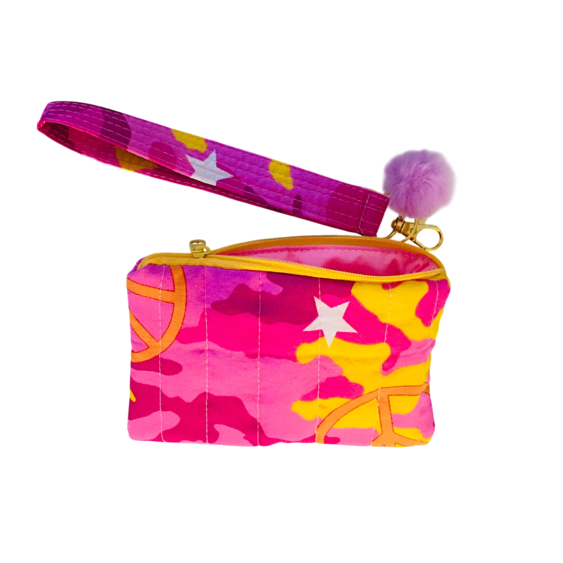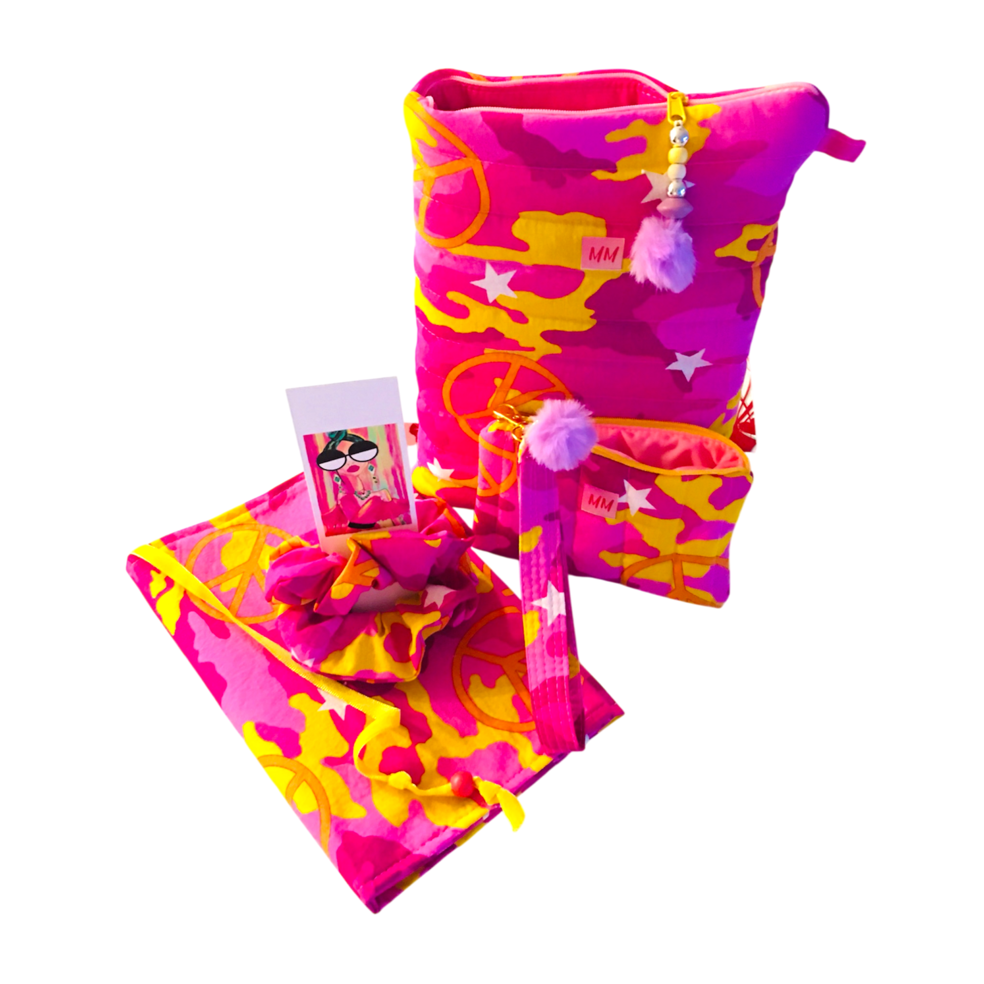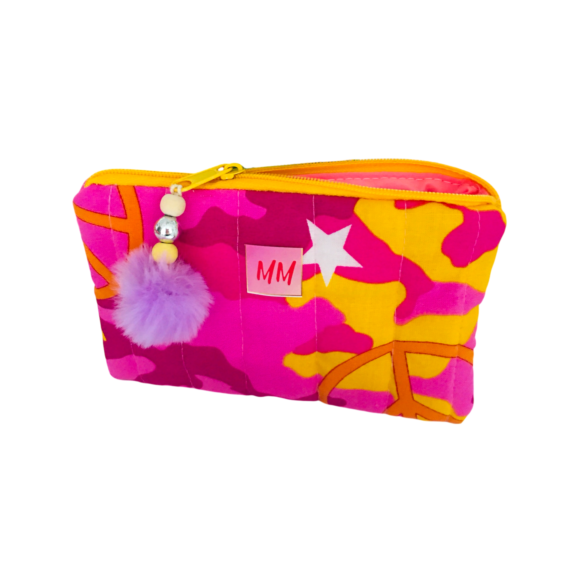 Le coffret Peace and Love aux couleurs rose peppermint, rose framboise, fuchsia et jaune. Munie d'un imprimé style camouflage, rose peppermint avec dessin peace and love de couleur orangé et des imprimer d'étoile blanche. L'intérieur en coton rose gomme, la fermeture éclair rose avec attache jaune, le tout assorti d'une breloque avec des billes argenté, des billes crème et d'un pompon lilas.